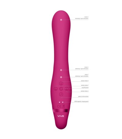 The Vive Suki Triple Action Strapless Strap On Vibrator in pink offers a versatile and pleasurable experience for couples. Key features include its triple-action design, which provides internal and external stimulation simultaneously, and a strapless design that allows for hands-free use. Made from body-safe silicone, it is waterproof and easy to clean. The vibrator features multiple vibration settings for customizable pleasure. Its unique selling points include the ability to enhance intimacy without the need for straps, making it ideal for various body types and preferences. Perfect for those seeking to explore new dimensions of pleasure together.